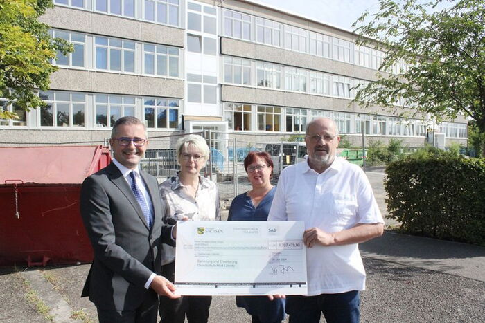 Im Hintergrund wird weiter fleißig gewerkelt. Im Vordergrund übergibt Wilfried Kühner vom Sächsischen Kultusministerium einen Scheck in Höhe von 1,7 Millionen Euro an die Schulleiterin Kathrin Nagel, die stellvertretende Hortleiterin Daniela Dittrich und Bürgermeister Detlef Hoffmann.
