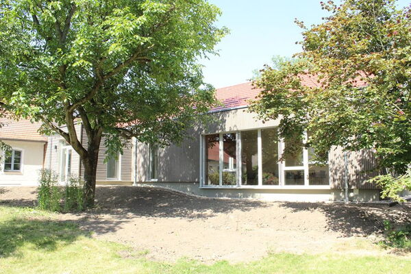Vom großen Veranstaltungsraum des neuen Anbaus (r.) aus genießt man einen idyllischen Blick in den Pfarrgarten. Links ist noch ein kleiner Abschnitt des alten Gebäudeteils zu erkennen. Foto: (Wsp) Phillipp