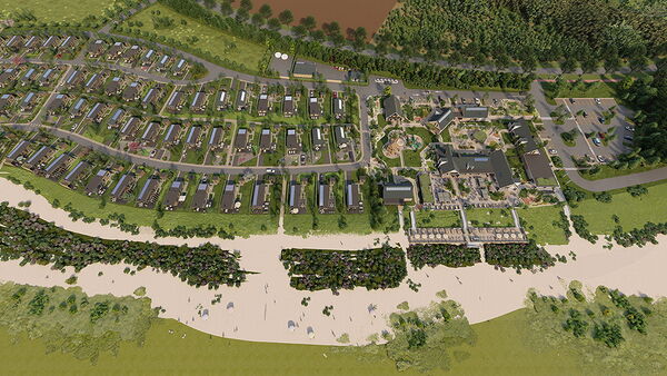 So soll das Ferienresort einmal aussehen. Inzwischen plant der Investor nur noch mit 121 kleinen Ferienhäusern sowie einer Art „Marktplatz“ mit Restaurant und Kulturscheune (halbrechts zu sehen). Grafik: FHG floating house